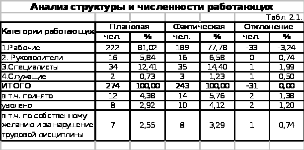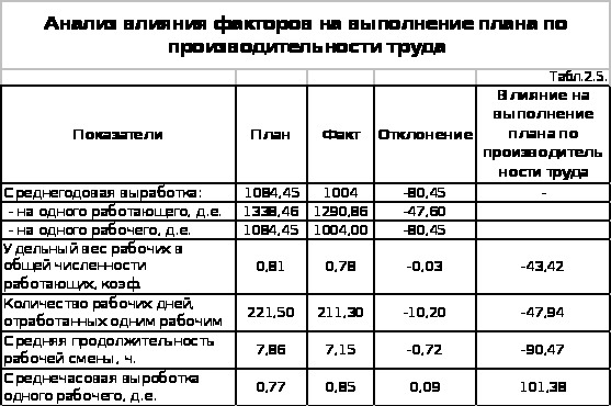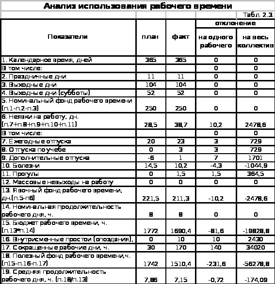 В отчетном году численность работающих уменьшилась по сравнению с прошлым годом на 31 человек. Это связано с комплексной механизацией и автоматизацией производственных процессов, внедрение новой более производительной техники, усовершенствование технологии и организации производства. Также наблюдается динамика увеличения текучести кадров за счет роста приема и увольнению работающих. В ходе анализа выявилось, что явочный фонд рабочего времени на одного рабочего по сравнению с прошлым годом уменьшился на 10,2%, на это повлияло увеличение продолжительности основных и дополнительных отпусков, увеличение количества прогулов и отпусков по учебе. Резервами увеличения объема производства продукции является часовая выработка одного рабочего и сокращение численности рабочих, количества рабочих дней отработанных одним рабочим, средней продолжительности смены. Среднечасовая выработка одного рабочего увеличилась на 0,09 за счет изменения удельного веса рабочих в общей численности работающих, количества рабочих дней отработанных одним рабочим, средней продолжительности рабочей смены.
