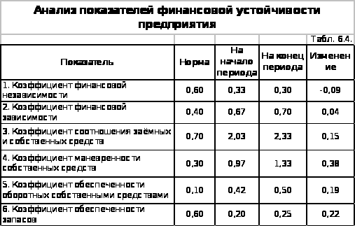Коэффициент финансовой независимости на конец периода уменьшился на 0,09 за счет уменьшения собственного капитала. Коэффициент финансовой зависимости увеличился на 0,04 за счет увеличения долгосрочных обязательств и кредиторской задолженности. На начало периода приходится 2,03 д.е. заемных средств вложенных в активы на 1 д.е. собственных. Коэффициент маневренности собственных средств на конец периода увеличился на 0,38 и составил 1,33, это является положительным моментом. Коэффициент обеспеченности оборотных активов собственными средствами на конец периода составил 0,5 и увеличился на 0,19 по сравнению с прошлым годом, это свидетельствует о том, что предприятие достаточно обеспечено собственными оборотными активами и в случае необходимости может расплачиваться с кредиторами. На конец периода коэффициент обеспеченности запасов увеличился на 0,22 и составил 0,25, таким образом, 25% запасов сформировано за счет собственных средств, что является положительным моментом для предприятия.