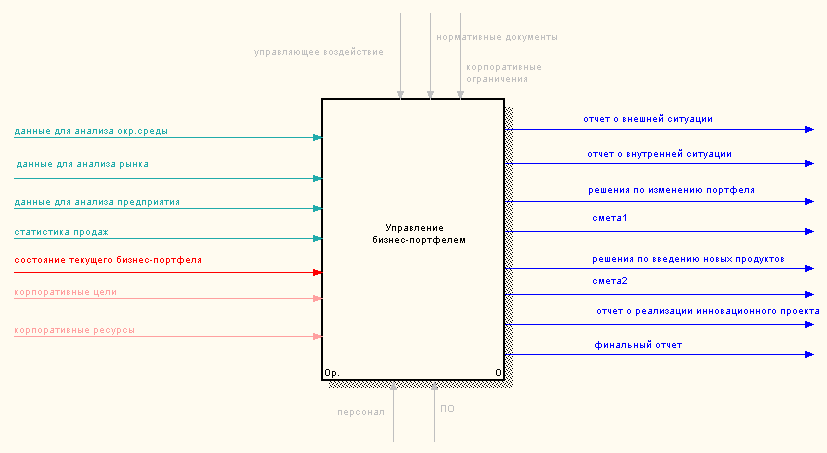 На рисунке 4.1 представлена контекстная диаграмма процесса «Управление бизнес-портфелем». Определена входная информация, которая некоторым образом изменяется работой и превращается в выходную информацию. При этом указаны стрелки механизма (работа осуществляется силами персонала и существующего программного обеспечения) и управления (выполнение работы подчинено управляющему воздействию, нормативным документам и осуществляется с учетом корпоративных ограничений).