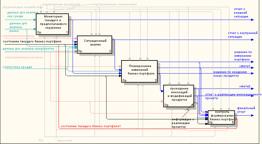 На основании информации о состоянии текущего бизнес-портфеля, проведенного мониторинга текущего и предполагаемого окружения, проведенного ситуационного анализа, корпоративных ресурсов, статистики продаж проводится планирование изменений бизнес-портфеля. В ходе которого, проводится анализ матрицы BCG, анализ возможностей или необходимостей введения новых продуктов, принятие решений по изменению бизнес-портфеля и примерное определение бюджета и сроков этих изменений. |