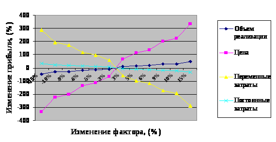 наиболее сильное влияние на изменение прибыли оказывает изменение цены, о чём свидетельствует наибольшее значение показателя «Сила операционного рычага по цене». Изменение таких показателей, как объём реализации, переменные и постоянные затраты, также приводит к изменению прибыли, но в меньшей степени.