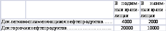 Одновременно с этим для нефтебаз, размещаемых на промышленных предприятиях, норма хранения ограничена и зависит от характера нефтепродукта и типа хранилища. Суммарный объем в резервуарах и зданиях (площадках) для хранения нефтепродуктов в таре на этих складах допускается в следующих количествах (в м3):