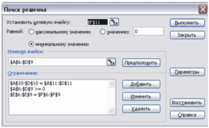 Викликаємо “Поиск решений”, вказуємо цільову комірку та заносимо усі обмеження: