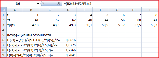 Такое сопоставление позволяет оценить приближенные значения коэффициентов сезонности кварталов F(-3), F(-2), F(-1) и F(0) Эти значения необходимы для расчета коэффициентов сезонности первого года F(1), F(2), F(3), F(4) и других параметров модели Хольта –Уинтерса.