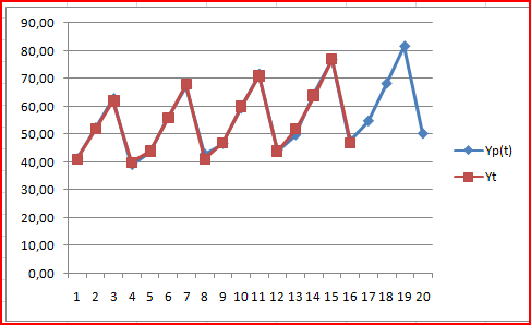 Рассчитаем значения Yp(t), a(t), b(t), F(T) для t=1 значения параметров сглаживания α1=0,3, α2=0,6, α3=0,3.