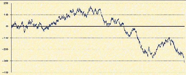 Все ответили, что счет будет колебаться вокруг нуля. Моделируем такую ситуацию. Возьмем S&P с 1991 года, дальше генерим вышеописанным способом столбец из 1 и –1, которые соответствуют длинной или короткой позициям. Посмотрим на варианты графиков сальдо нашего теоретического счета, управляемого случайной торговой системой.