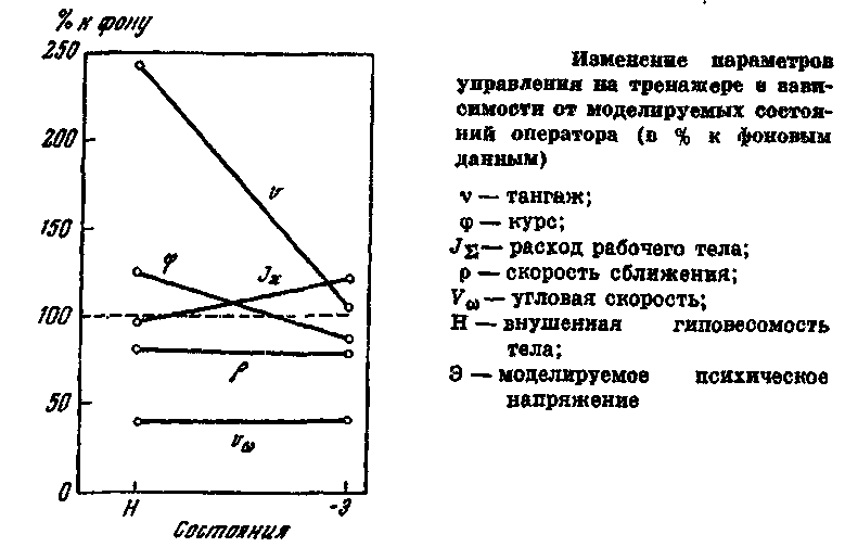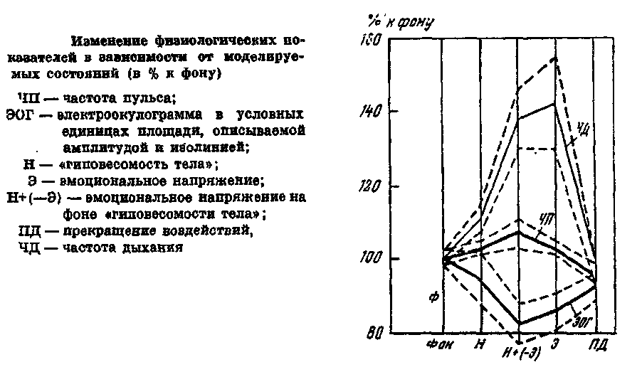 Моделируемые психические состояния оператора проявлялись не только в виде субъективных переживаний, но и в изменении соответствующих физиологических показателей. Показатели закономерно изменяются в зависимости от специфики психического состояния. Характерно, что сильное психическое напряжение на фоне его постгипнотической реализации протекает с преобладанием парасимпатической иннервации, но с выраженным нарастанием частоты дыхания. В то же время в первые периоды субъективного переживания гиповесомости тела наблюдается преобладание симпатикотонических влияний, в результате чего частота пульса заметно возрастает без существенного учащения дыхания, если «гиповесомость» не сопровождается психическим напряжением. Если же состоянию гиповесомости сопутствует психическое напряжение, то в эксперименте возникают крайние формы гипервентиляции. Следует отметить, что в любом случае в процессе работы оператора адаптационные механизмы физиологических систем приводят к снижению явлений тахикардии, однако не уменьшают в заметной степени явлений гипервентиляции.