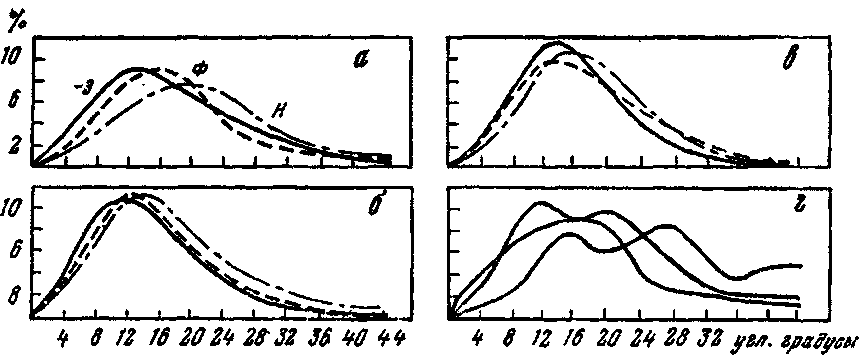 Изменение точности зрительной оценки крутизны склонов лунного рельефа находится в очень сложной зависимости от различных психических состояний и условий освещения и визирования. Средние данные, характеризующие эту зависимость, представлены на рис. 50. Наиболее общей закономерностью и здесь оказывается повышение точности работы при моделируемом эмоциональном напряжении. Субъективное переживание частичной весомости тела нередко сопровождается тенденцией к снижению точности визуальных метрических оценок.