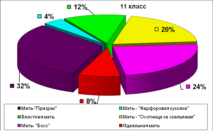 - в 11-ых классах также преобладает проблема бесконтрольности подростков. Но тут появляется типичная для этого возраста проблема выпуска детей во взрослую жизнь. Количество идеальных матерей очень низкое.