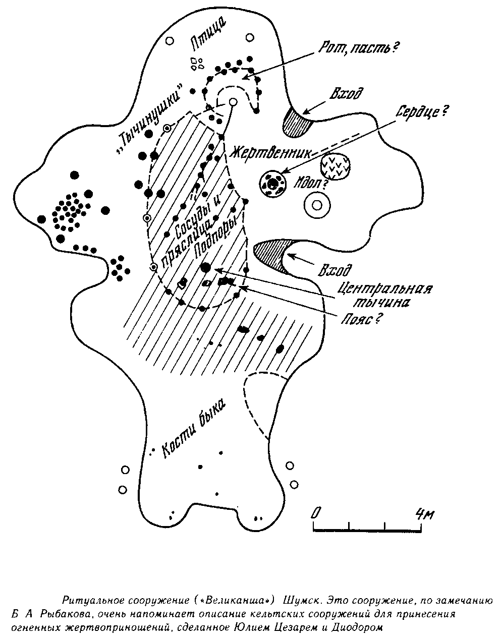 Приведем классический пример из «Записок о галльской войне» Юлия Цезаря: «Весь галльский народ очень привержен своим обрядам...» и далее «Люди, пораженные тяжкими болезнями, а также проводящие жизнь в войне и других опасностях, приносят или дают обет принести человеческие жертвы, этим у них заведуют друиды. Именно галлы думают, что бессмертных богов можно умилостивить не иначе как принесением в жертву за человеческую жизнь также человеческой жизни. У них заведены даже общественные жертвоприношения своих соплеменников. Некоторые племена употребляют для этой цели огромные чучела, сделанные из прутьев, члены которых они наполняют живыми людьми. Они поджигают их снизу, и люди сгорают в пламени. Но, по их мнению, еще угоднее бессмертным богам принесение в жертву попавшихся в воровстве, грабеже или другом тяжком преступлении, а когда таких людей не хватает, тогда они прибегают к принесению в жертву даже невинных». Мы еще вернемся к этому важнейшему описанию человеческих жертвоприношений, которые удивительным образом совпадают с данными археологических раскопок в Шумске, показывающими следы подобного ритуала, видимо, существовавшего в Древней Руси, что подтверждается и летописными свидетельствами мести княгини Ольги древлянским послам.