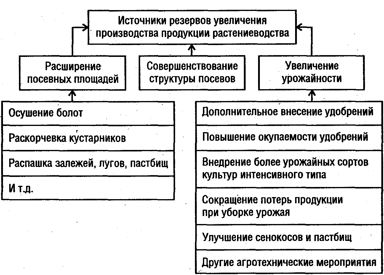 ческих видов деятельности на различных по качеству почвах обусловливают необходимость рационального размещения культур, что в сочетании со специализацией способно оказать весомое влияние не получение результатов. Таким образом, существенным резервом увеличения производства продукции в растениеводстве является улучшение структуры посевных площадей, т.е. увеличение доли более урожайных культур в общей посевной площади. Для расчета величины этого резерва сначала необходимо разработать более оптимальную структуру посевов для данного хозяйства с учетом всех его возможностей и ограничений, а потом сравнить фактический объем продукции с возможным, который будет получен с той же общей фактической площади, при фактической урожайности культур, но при улучшенной структуре посевов.