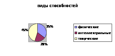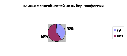 Из данной диаграммы видно, что 40% опрошенных в той или иной мере связали свои способности с выбором профессии. Для 60% способности не стали основой выбора профессии по следующим причинам: во-первых, не было учебного заведения с нужной специальностью, во-вторых, родители считали, что профессия музыканта, спортсмена, художника не гарантирует достаточных средств для жизни, в-третьих, различные жизненные ситуации. Большая часть применяют свои способности в художественной самодеятельности, в спортивных соревнованиях для самосовершенствования, т.е. по мере необходимости. Люди, которые в детстве развивали свои способности, например, занимались плаванием, в настоящее время считают, что именно это помогло им сохранить хорошее здоровье. Педагоги, которые в детстве занимались в художественной школе, сейчас применяют свои знания и умения при оформлении учебного кабинета.