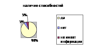 90 % детей отметили у себя наличие способностей. Можно предположить, что остальные 10 % - это дети потенциал которых не раскрылся, либо не определился в каком-либо конкретном виде деятельности.