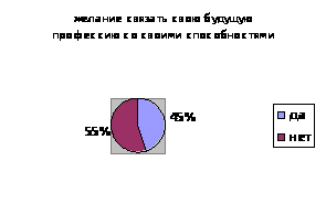 55 % опрошенных не собираются связывать свою будущую профессию с имеющимися у них способностями, т.к. с одной стороны стремятся выбрать профессию, востребованную на рынке труда, считают, что у родителей будет не достаточно средств для обучения нужной специальности, которую можно получить в учебных заведениях Москвы и Санкт-Петербурга. С другой стороны не считают творческие и физические способности основанием для выбора будущей профессии, а относят их к сфере досуга.
