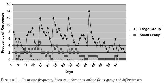Стандартное количество участников традиционной фокус-группы равняется 8. С увеличением количества участников могут возникнуть проблемы с управлением и дальнейшим транскрибированием записи дискуссии. Преодолеть эту проблему позволяют асинхронные онлайн фокус-группы (форумы), в которых допускается использование большего количества участников. Диалог обычно продолжается в течение 4-5 дней и заканчивается организацией поточной обработки. В одном из исследований (Williams) сравнивались 2 асинхронные фокус-группы с разным количеством участников: в первой – 45 человек, во второй – 15. Вопросы для групп подавались в один и тот же день, продолжительность составляла 55 дней. Результаты представлены на следующем графике: