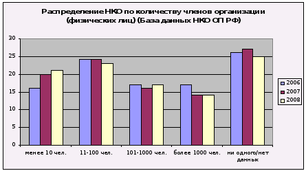 Превалируют организации со сравнительно небольшим числом членов (до 100 человек). Крупные по количеству членов НКО, включающие более 1000 человек, составляют около 14%.