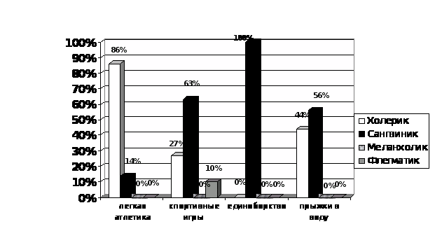 Среди людей, занимающихся легкой атлетикой большинство (86%) опрошенных холерики и 14% - сангвиники. Данные виды темпераментов относят к группе «сильных» типов. Возбудительные процессы, особенно у холериков, преобладают над тормозными; люди с данными типами ВНД эмоциональны, стремительны, подвижны. Но, у холериков, вследствие неуравновешенности нервных процессов, может наблюдаться быстрое истощение, раздражительность, несдержанность, вспыльчивость, что негативно может сказаться на спортивных результатах.