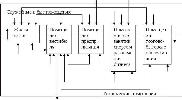 Первоначально здание гостиницы строилось в виде массива, отдельно располагаемого или сопряженного с окружающими общественными и жилыми зданиями. Длительный поиск наилучших планировочных решений привел к созданию пространственной композиции, специально предназначенной для деятельности, выполняемых в гостиницах. Помещения для ночевки туристов обосабливаются от помещений, связанных с оказанием иных услуг туристам. Соответствующие помещения распределяются в различные функциональные (архитектурные) блоки.