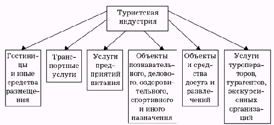 Если туристскую индустрию рассматривать в более широком плане, то это самостоятельный народнохозяйственный комплекс, так как кроме перечисленных субъектов, которые непосредственно связаны с туризмом, в нее входят и различные специализированные предприятия, не имеющие ярко выраженного туристского характера. К таким отраслям относятся пассажирский транспорт (воздушный, водный, автомобильный, железнодорожный) с его разветвленной сетью технических служб, транспортное машиностроение и автомобилестроение, топливная промышленность, капитальное и дорожное строительство, производство сувениров, пищевая промышленность, многие отрасли сельского хозяйства и т.д., а также сфера услуг, которыми пользуется турист.