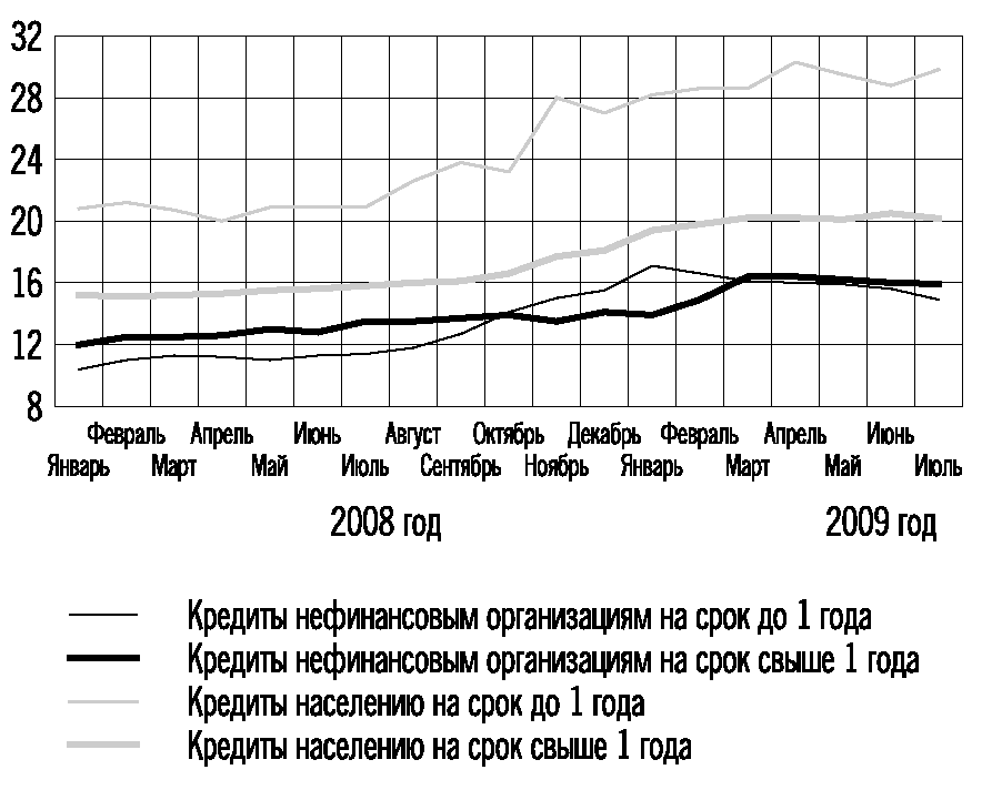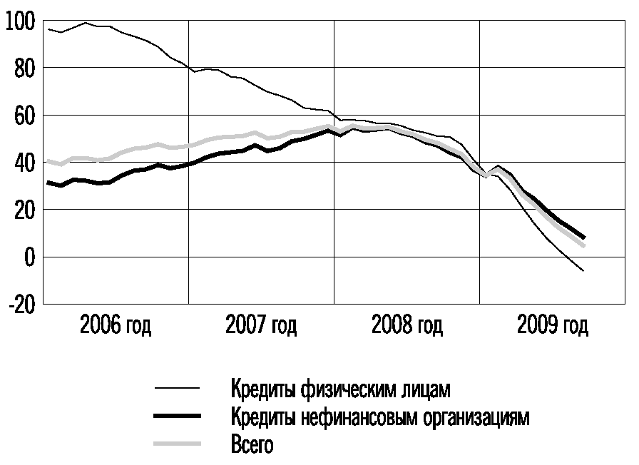 Темпы прироста задолженности по кредитам нефинансовым организациям в рублях и иностранной валюте (в рублевом выражении), по предварительным данным, за январь-август 2009 года значительно снизились – до 2,4% по сравнению с ростом на 26,9% за январь-август 2008 года. Годовой темп прироста этого показателя на 1.09.2009 составил 8,4% против 47,1% на соответствующую дату 2008 года. Задолженность по кредитам, предоставленным физическим лицам в рублях и иностранной валюте (в рублевом выражении), за январь-август 2009 года сократилась на 8,9% по сравнению с ростом на 30,9% за январь-август 2008 года. Задолженность по кредитам физическим лицам на 1.09.2009 сократилась в абсолютном выражении по сравнению с аналогичной датой прошлого года на 5,9% (на 1.09.2008 – прирост на 51,0%). [7]