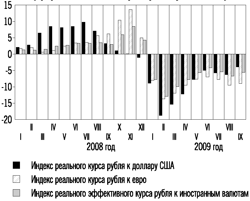 По состоянию на 1 октября 2009 года официальные курсы доллара США и евро к рублю составили 30,0087 рубля за доллар США и 43,8877 рубля за евро, повысившись с начала года на 2,1 и 5,9% соответственно. Реальный эффективный курс рубля к иностранным валютам в сентябре 2009 года по отношению к декабрю 2008 года снизился на 5,6%. [7]
