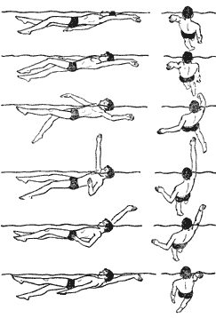 Общая координация движений. При плавании на спине наиболее рациональным, обеспечивающим телу равномерное поступательное движение и создающим наиболее устойчивое положение его в воде является шестиударный кроль. Согласование движений рук и ног осуществляется следующим образом.