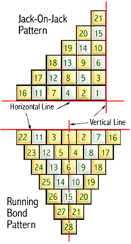 Варіант "в розбіг" або метод "цегельної кладки"має зміщення по шву в кожному рядку. Можна використовувати прямокутну плитку,але краще квадратну.