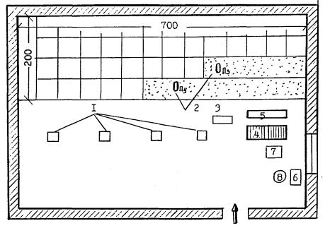 П3 і П4 - плиточники; I - маяки; 2 - розчин під плитку; 3 - візок для розчину; 4 - піраміда з підготовленими плитами; 5 - ящик з інструментом; 6 - приймальний ящик з розчином; 7-клей; 8 - відро під розчин для швів.