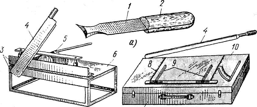 Рис.4.6 Інструменти і пристосування для різання полівінілхлоридних плиток: а - ніж-різак, би - пристосування для різання, в - ножиці гільйотин; І - лезо, 2 - ручка, З - кути, 4 - ніж, 5 - затискний пристрій, 6 - стіл-підставка, 7 - ящик для інструменту, 8 - шкала з розподілами, 9 – рухомі лінійки, 10-нерухомий ніж