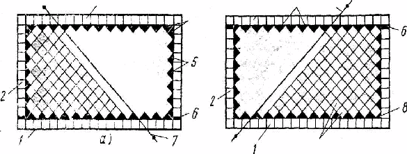 Перед початком облицьовування стіни провішують, встановлюють маяки і розмічають місцеположення фризового ряду, що обрамляє поверхню (дзеркало) облицьовування. При цьому до внутрішньої сторони фриза повинне примикати ціле число трикутних плиток 4, 5 (Рис.6.1, а). Починають облицьовування з укладання фризових плиток по периметру стіни.