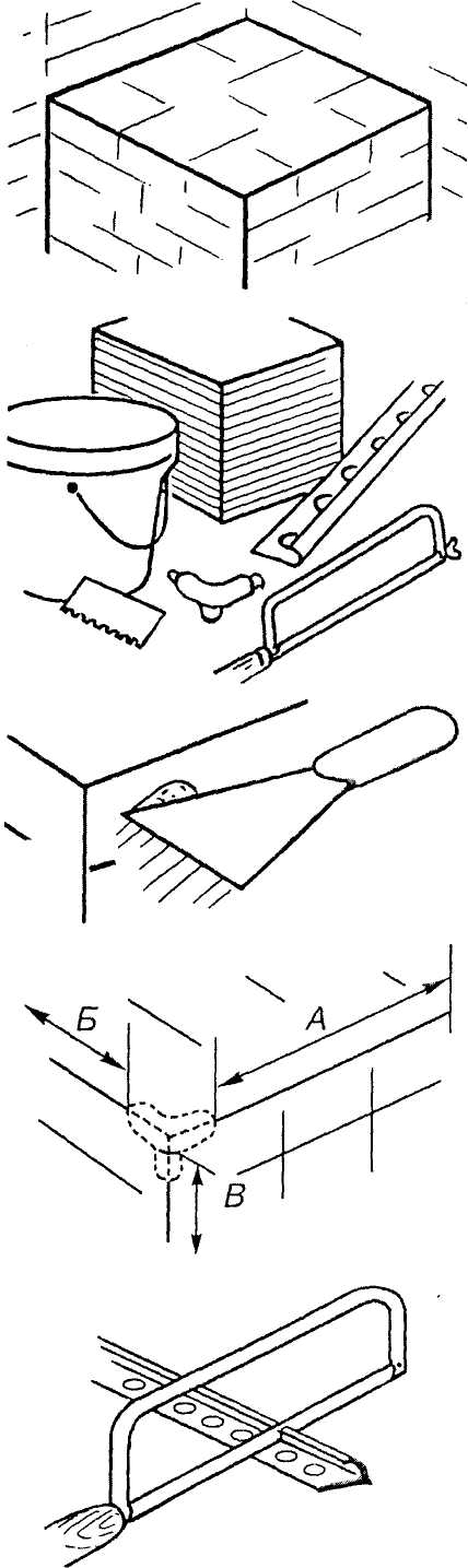 У ході облицювальних робіт потрібні - неповно мірі плитки, які одержують з цілих. Для цього спочатку відмірюють потрібний розмір на повномірній плитці сталевою лінійкою з міліметровими розподілами. Лінію проводять олівцем або (рейсмусом) (Рис.4.2, а). Потім, сильно натискуючи, склорізом 7 або різцем 3 (Рис.4.2, б) з роликом 5 з твердого сплаву (іноді це роблять двічі) прорізають глазур і частину черепка плитки (Рис.4.2, в). Після цього нижньою стороною плитки ударяють об ребро дошки, так щоб лінія надрізу потрапила на ребро. При цьому плитка розколюється точно по надрізу (Рис.4.2, г). Для відламування вузьких надрізаних смуг керамічної плитки використовують плитколом (Рис.4.2, д).