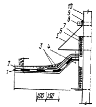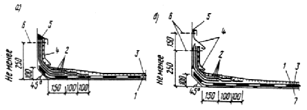 1 - основной водоизоляционный ковер (по табл.2); 2 - слои дополнительного водоизоляционного ковра с верхним слоем из рубероида (или толя) с крупнозернистой или чешуйчатой посыпкой (по п.2.5); 3 - защитный слой (согласно табл.2); 4 - защитный фартук из оцинкованной кровельной стали; 5 - герметизирующая мастика (согласно п.2.9); 6 - оси крепежных элементов (для закрепления слоев водоизоляционного ковра, защитных фартуков);