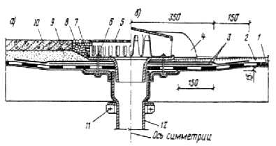 10 - бетонные или армоцементные плитки (по п.2.11); 11 - зажимной хомут; 12 - чаша водоприемной воронки