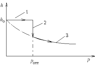 Рис.Ф.18.7. График изменения высоты слоя мерзлого грунта h от давления p: 1 - сжатие в мерзлом состоянии; 2 - просадка вследствие происшедшего оттаивания при давлении p>отт>; 3 - сжатие в оттаявшем состоянии