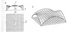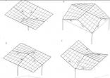 На рис.12 дана схема покрытия, представляющая собой минимальную поверхность с контуром, состоящим из четырёх дуг окружностей. Поверхности этого вида имеют наименьшую площадь при заданном контуре и одинаковую напряжённость в любой точке. Форма поверхности зависит только от формы кривой контура, отдельные её участки имеют положительную и отрицательную переменную кривизну.
