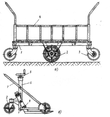 Рис. Тележки для транспортировки электрооборудования изделий и материалов в монтажной зоне на МЭИ. а -- типа ТРР; б — типа ТГЖ; в — тележка универсальная с подъемной платформой, г — типа ТД; / — рама; 2 колесо; 3 — ролик; 4 — съемный борт; 5 — мурвал; 6 — кожух-винт; 7 - - ручка; 8 - опорные ролики; 9 - - гидравлическое подъемное устройство; 10 -- площадка; // тормозное устройство; 12 ограждение; 13 — дышла; 14 — тяги.