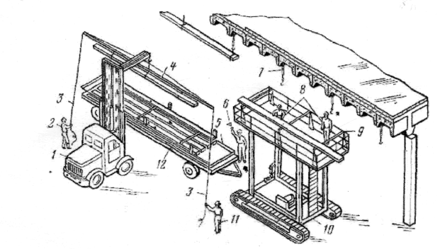 Рис. Монтаж блоков шинопровода с использованием самоходных выдвижных подмостей типа ПВС-8 (ПВС-12): 1 — автопогрузчик; 2 — электромонтажник 2-го разряда; 3 — веревочная оттяжка; 4 — траверса; 5 — контейнер, б — электромонтажник 6-го разряда, 7 -- крепежная конструкция; 8 — электромонтажники 3-го и 4-го ' разрядов; 0 козлы; Л' самоходные выдвижные подмости; и электромонтажник 3-гст разряда; 12 двухосным прицеп.