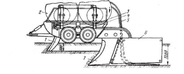 Рис- Кабелеукладчик. 1 — вспомогательный нож; 2 — кабельный барабан; 3 — тележка; 4 — площадка о ограждением; 5 — прокладываемый кабель; 6 — кассега; 7 — основной нож.