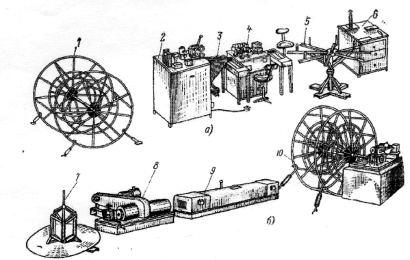 Рисс Технологическая линия по заготовке тоосовых электропроводок. а — сборка тросовых электропроводок; б — обработка стальной проволоки;/ -инвентарный барабан; 2 — мерноподаюшее устройство: 3 — вьюшка для проводов, 4 — стол-стенд с механизмами и приспособлениями для перерезки проводов, снятия изоляции, скручивания, надрезки и сварки жил; 5 — вертушка для сматывания в бухты готовых отрезков тросовых проводок; 6 — механизм для перерезки проволоки с приспособлением для концевых петель; 7 — вертушка; 8 — механизм для рихтовки и очистки проволоки; 9 — сушильная печь для сушки стальной проволоки, покрытой антикоррозионным лаком; 10 — приемно-тянущий ба-рэбэн.