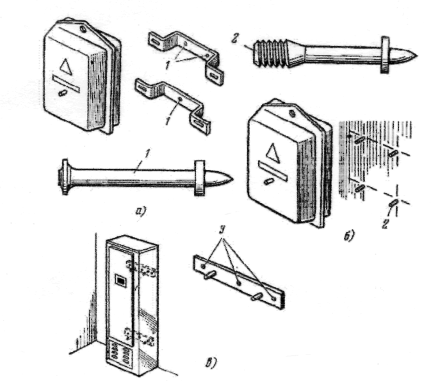 Рис. Виды крепления дюбеле: а - - несъемное крепление; б — съемное крепление аппаратов; в - - комбинированное крепление шкафов, / дюбель-гвоздь; 2 дюбель-винт; 3 — места пристрелки детали дюбель-гвоздями.