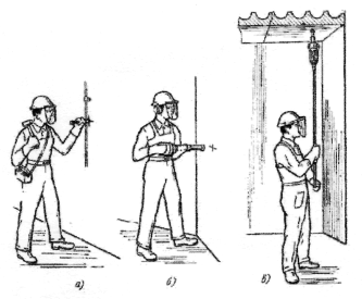 Рис. 21. Рабочие места пои работе с пиротехническими инструментами при работе. а - с пороховой оправкой; б -- со строительно-монтажным пистолетом; в -с ударной пиротехнической колонкой.