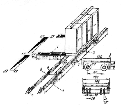 На рис. показан способ монтажа блоков электрооборудования с применением инвентарных приспособлений, конструкция которых разработана и внедрена организациями соблений, конструкция которых разработана и внедрена организациями Министерства энергетики и электрификации СССР. В комплект приспособлений входят катки 2, на которых устанавливают транспортируемые блоки электрооборудования; колея -/, набираемая из швеллеров № 8—12, скрепленных между собой шпильками 3 и накладками 6; рольганги 1 и склизы 5. Ролики катков регулируют по ширине швеллеров при помощи втулок, расположенных на осях катков. Рольганга служат для перемещения электрооборудования в направлении, перпендикулярном укладке колеи. Для этого из-под груза убирают катки, и груз опирается на ролики рольгангов, превышающих по высоте полотно колеи. На комплекте приспособлений, содержащем четыре катка, возможно перемещать до 2 т груза со скоростью не более 5 км/ч.