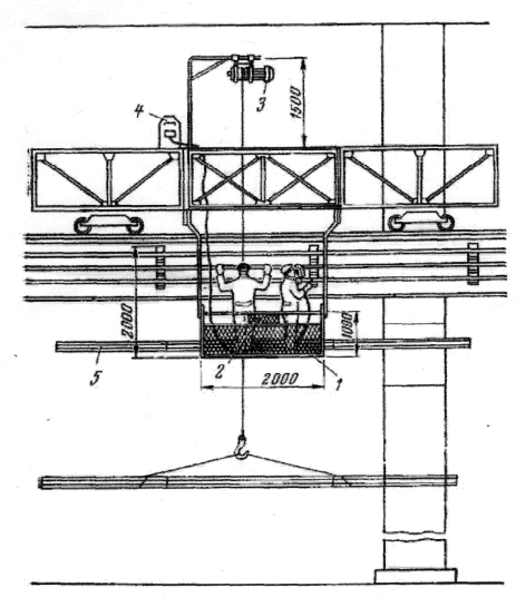 Рис. Монтаж троллейных линий с инвентарной люльки, закрепляемой на мое-крана. 1 — люлька; 2 — ящик с инструментами; 3 — кронштейн с электролебедкой; 4 сварочный аппарат; 5 — заготовленные троллеи или блоки троллейных лшшопроводов серии ШТА,