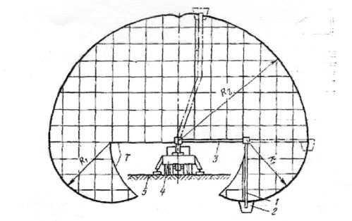 Ряс. Схема зоны обслуживания автогидроподъемника. - верхнее колено стрелы автогидроподъемника; 2 — корзина; 3 — нижнее колено стрелы автогидроподъемника; 4 - - автогидроподъемник: 5 - нулевая отметка пола, Я„ %2 — радиусы схемы зоны обслуживания; Т— кривая, ограничивающая зону обслуживания.