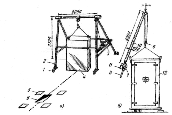 Рис. 18. Приспособления для установки электрооборудования на фундаменты. 7 — портальный подъемник; б - - штанговый подъемник; / - - колесо; 2 - - рама портального подъемника; 3 — ручная лебедка; 4 щит станции управления в шкафном исполнении; 5 —закладные детали для установки щита; 6 — проем для ввода кабелей в щит; 7 —ручной привод штангового подъемника; в — рукоятка; 9 — однорольный блок, 10 штанга, 11 рукоятка привода, II - распределительный пункт.