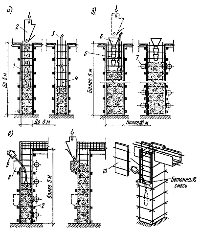 Колони заввишки більше 5 м бетонують ярусами, до 2 м - із загружением бетонної суміші і її вібрацією через бічні вікна в стінках короба (рис.2).