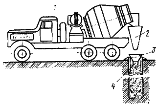1 - автобетонозмішувач; 2 - лоток; 3 - приймальна воронка; 4 - труба для подачі бетону (хобот)