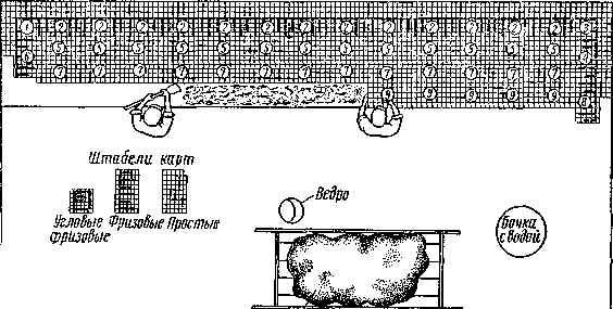 После отбора необходимого числа карт, соответствующих выбранному рисунку для фриза, пристенного ряда и основного фона, их предварительно (до укладки) подготавливают: прокалывают или прорезают бумагу, чтобы во время припрессовки карты к раствору из-под нее мог свободно выйти воздух. При помощи шнура-причалки и угольника укладывают первую угловую карту 1 (рис.2.1) фризового ряда бумагой вверх. Осаживают карту хлопушей или правилом вровень с маячным рядом до тех пор, пока раствор не заполнит швы между плитками, что заметно по намоканию бумаги над швом. В тех местах, где бумага не намокла, необходимо ее дополнительно проколоть, чтобы ликвидировать образовавшиеся воздушные мешки.