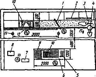 Рис.1.1. Схема организации рабочего места звена при устройстве полов с применением шаблона: 1 - правило, 2 - контрольная рейка, 3 - грабли, 4 - растворная тележка, 5 - запорные стержни, 6 - заготовочный стол, 7 - плитки, не пригодные для укладки в шаблон, 8 - плитки, подлежащие сортировке, 9 - отсортированная плитка, 10 - шаблон, 11 - маяк, 12 - маячная рейка. Примечание. Источник: [13,297]
