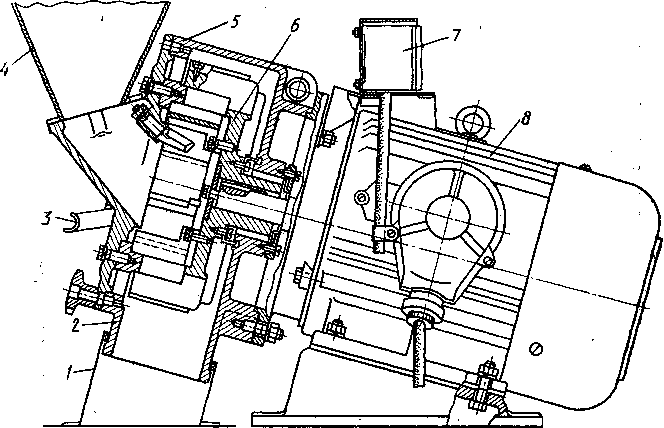 Рис.2.3. Мелотерка СО-53А: 1 - ротор, 2 - статор, 3 - крышка, 4 - воронка, 5-скребок, 6 - корпус, 7 - электродвигатель, 8 - плита